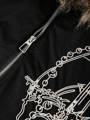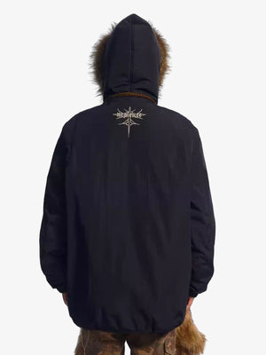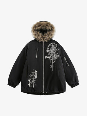 • Detail Features: Fur Hood, Zipper Closure, Graphic Print, Side Pockets