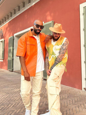 • Design Elements: Bold Abstract Print, Contrasting Collar