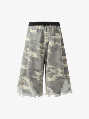 • Design Elements: Camouflage print pattern, distressed frayed hem, graphic patch decoration