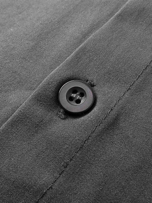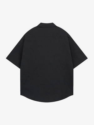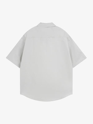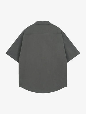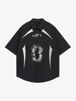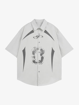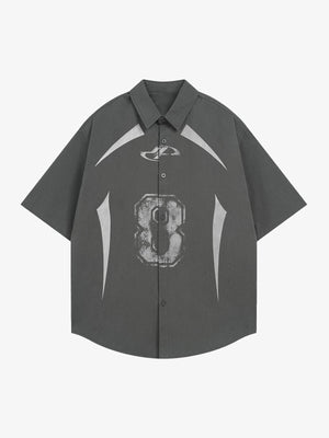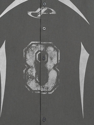 • Design Elements: Distressed number print, geometric white accents, button-down front