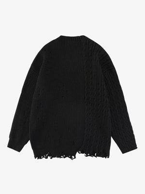 • Design Elements: Cable knit sleeves, distressed details along the hem and sides, ribbed cuffs and neckline
