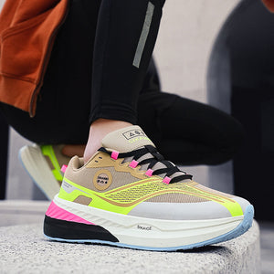 A charged palette of Black, White, Brown/Pink, and a bold slash of Yellow radiates pure kinetic energy. The colorblock detailing injects standout flair while balancing urban edge with sporty sophistication.