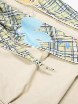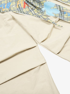 • Design Elements: Plaid overlay with graphic prints, asymmetrical design, wide-leg silhouette