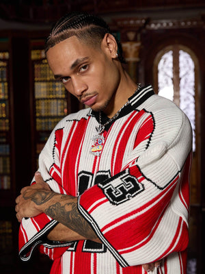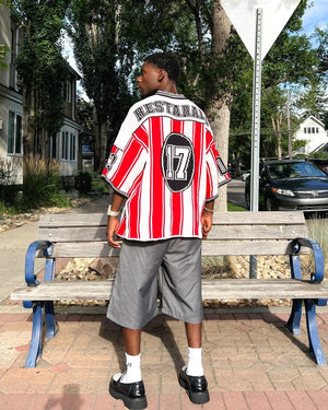 • Design Elements: Bold Red and White Stripes, Classic Soccer Style