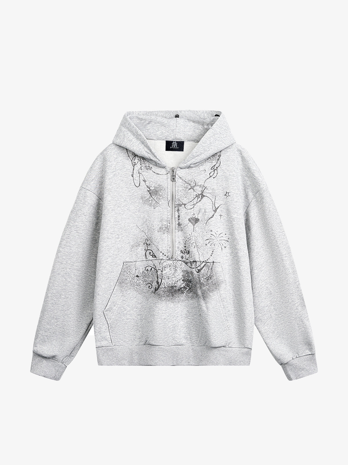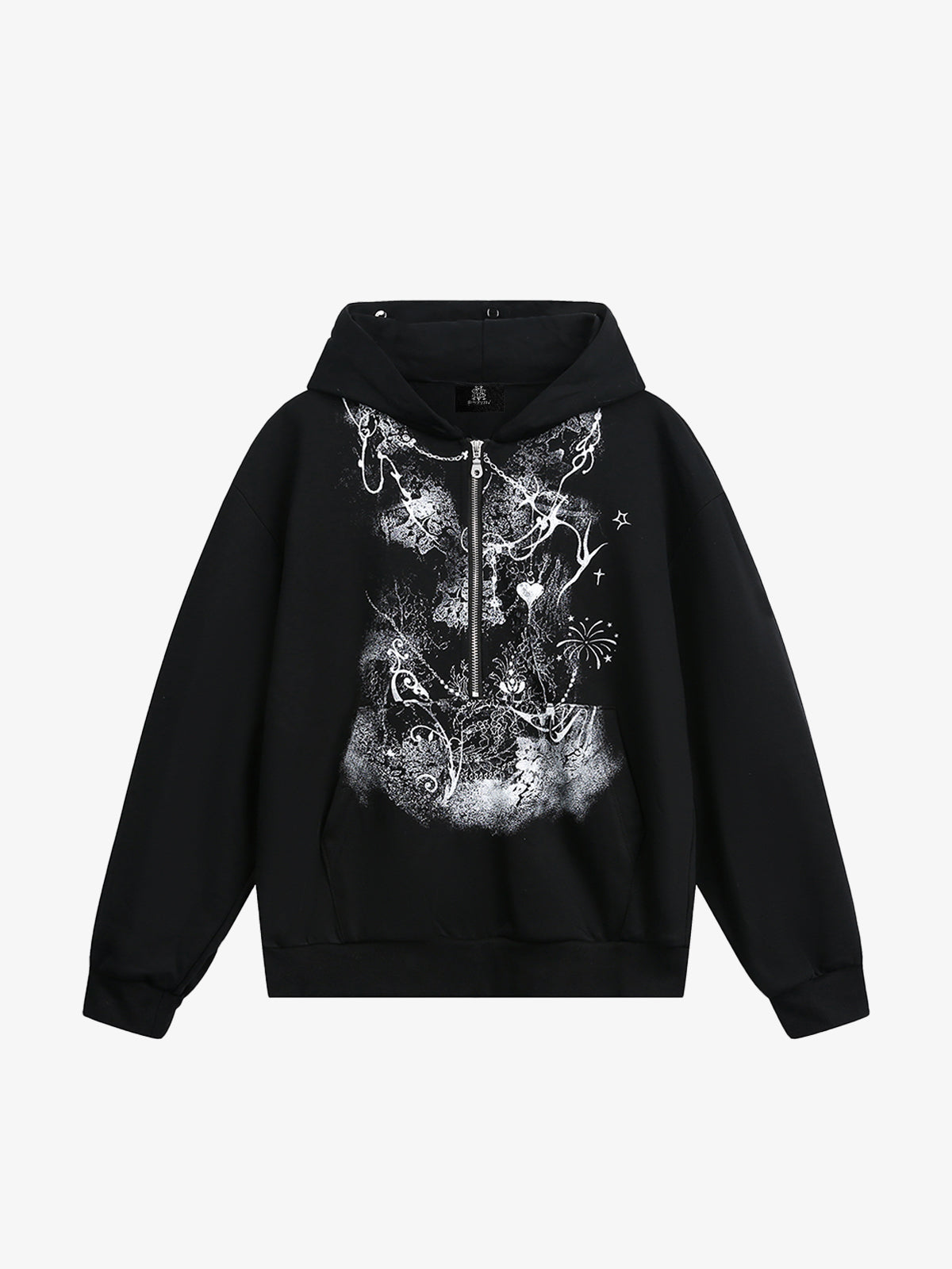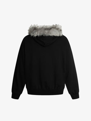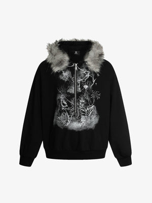 • Design Elements: Unique artistic print on the front, faux fur trim hood, half-zip closure