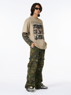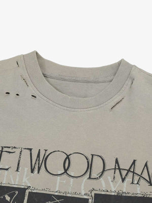 • Detail Features: Distressed holes along the hemline, graphic print on the chest, splatter paint effect