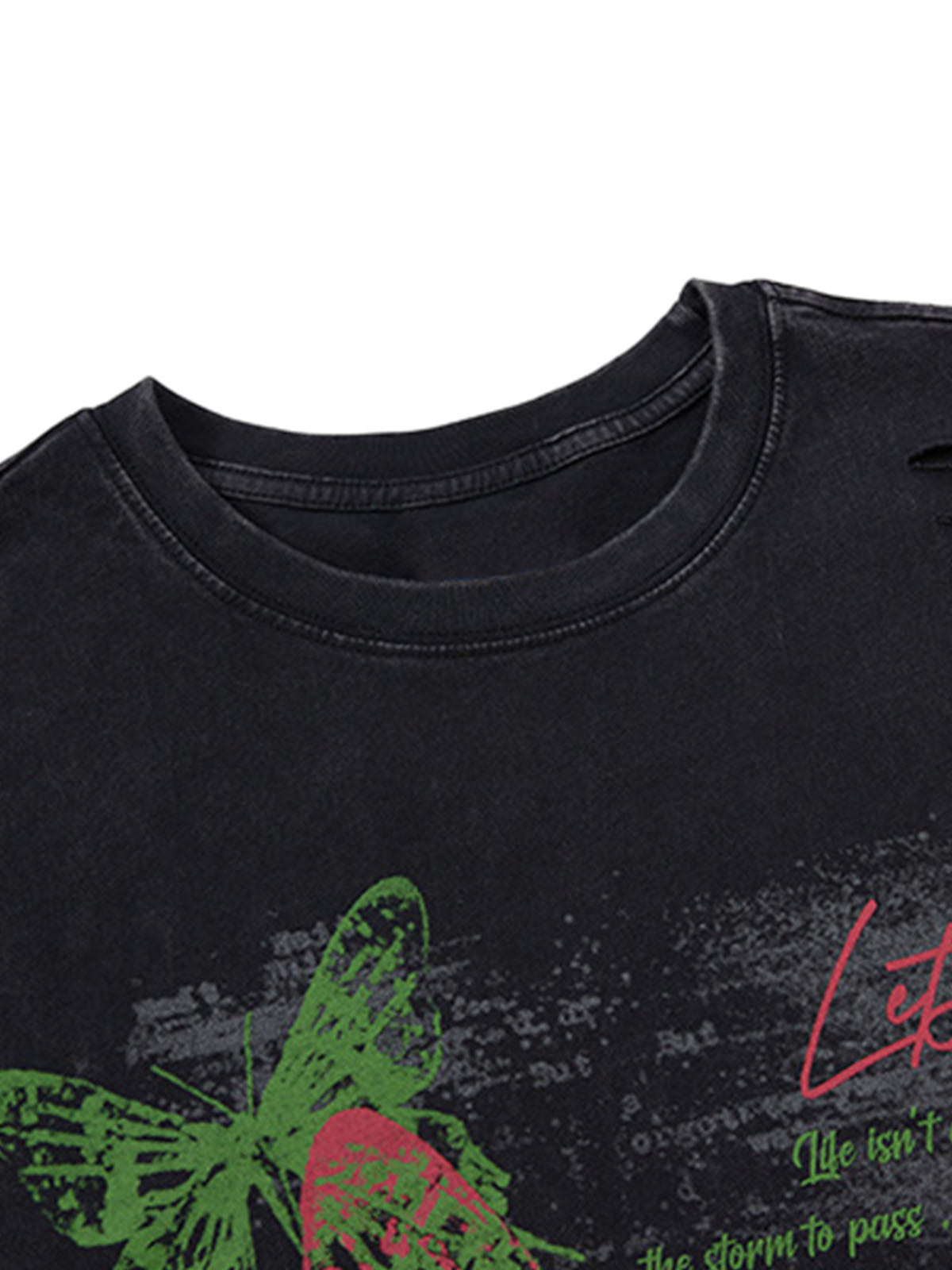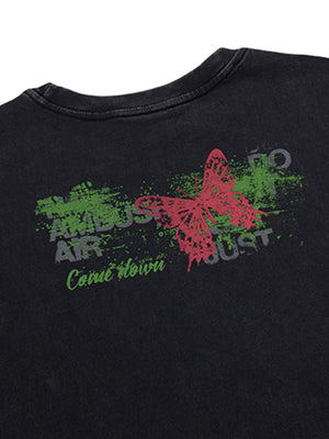 • Design Elements: Vibrant butterfly graphic print, distressed details, bold text overlays
