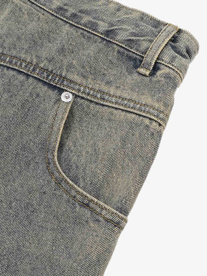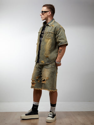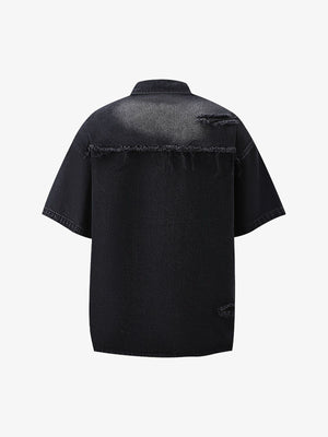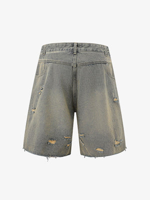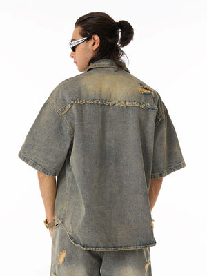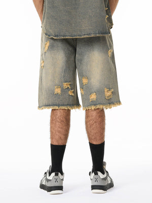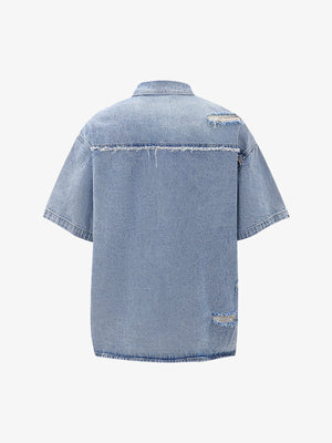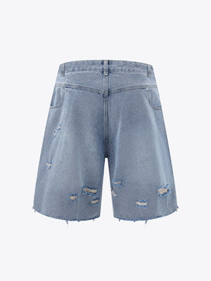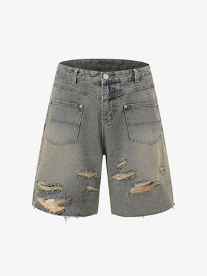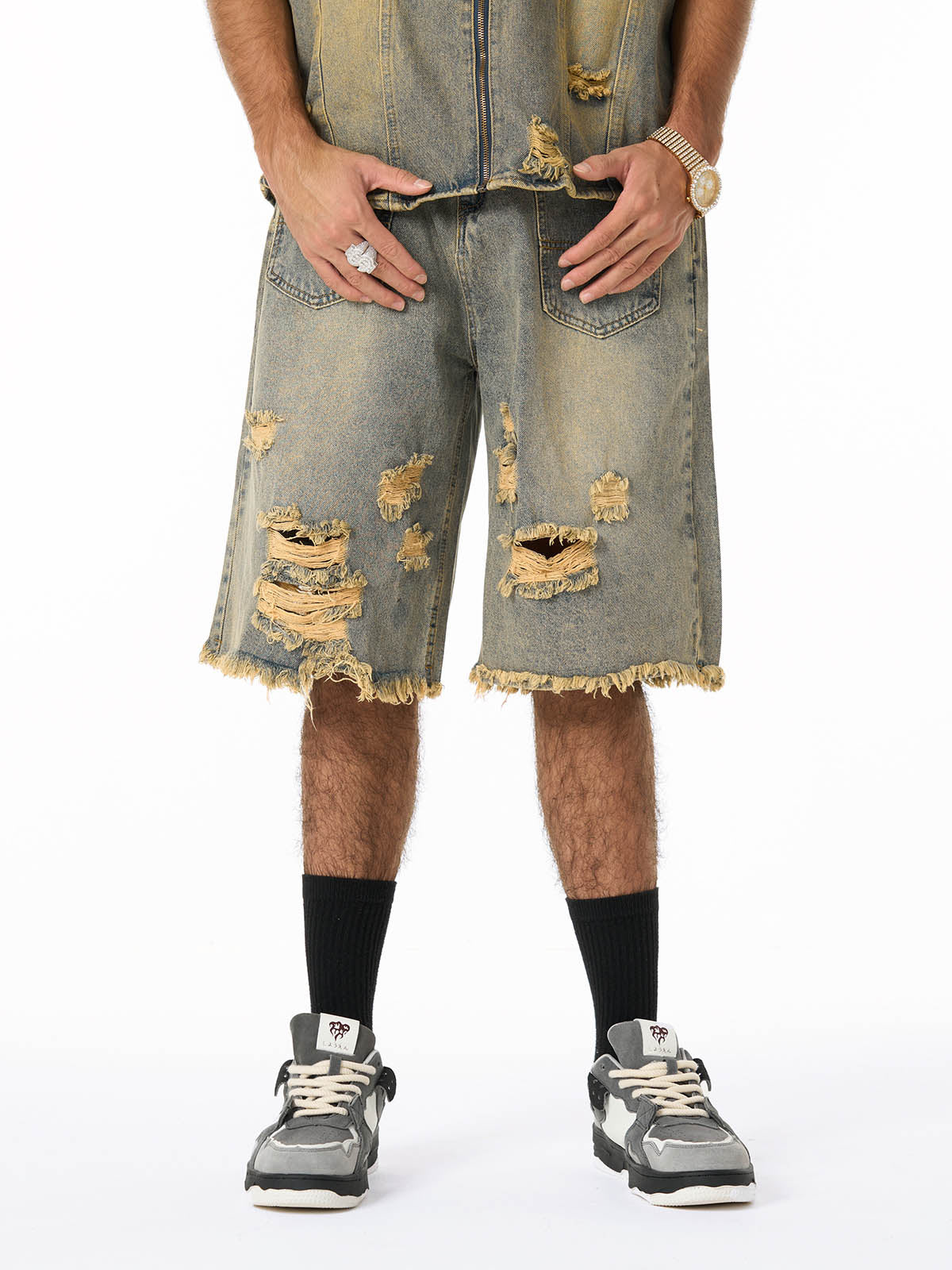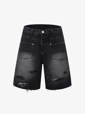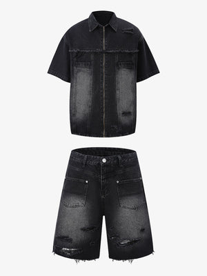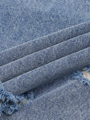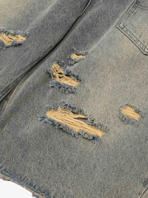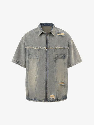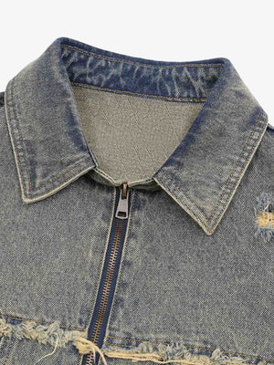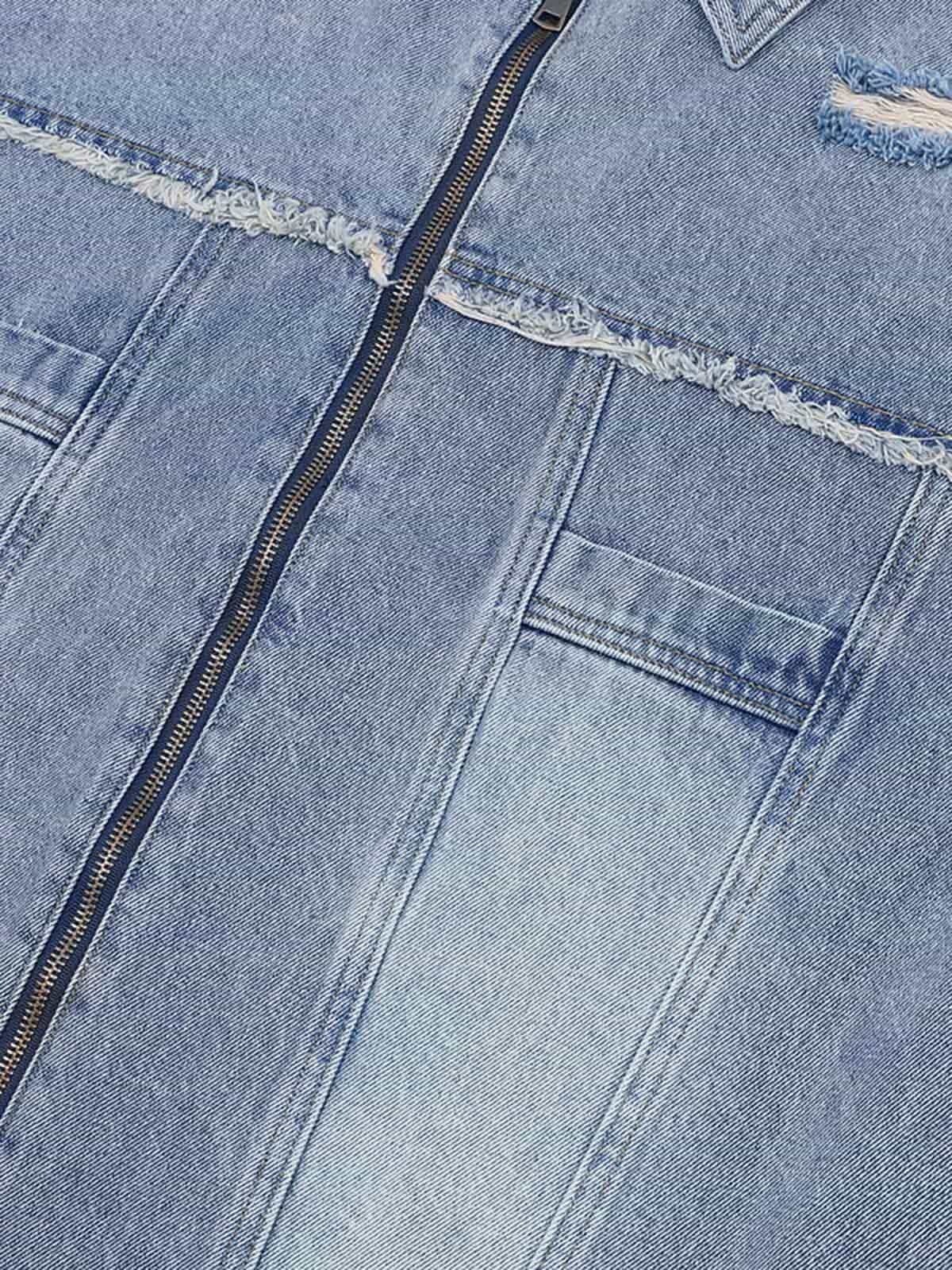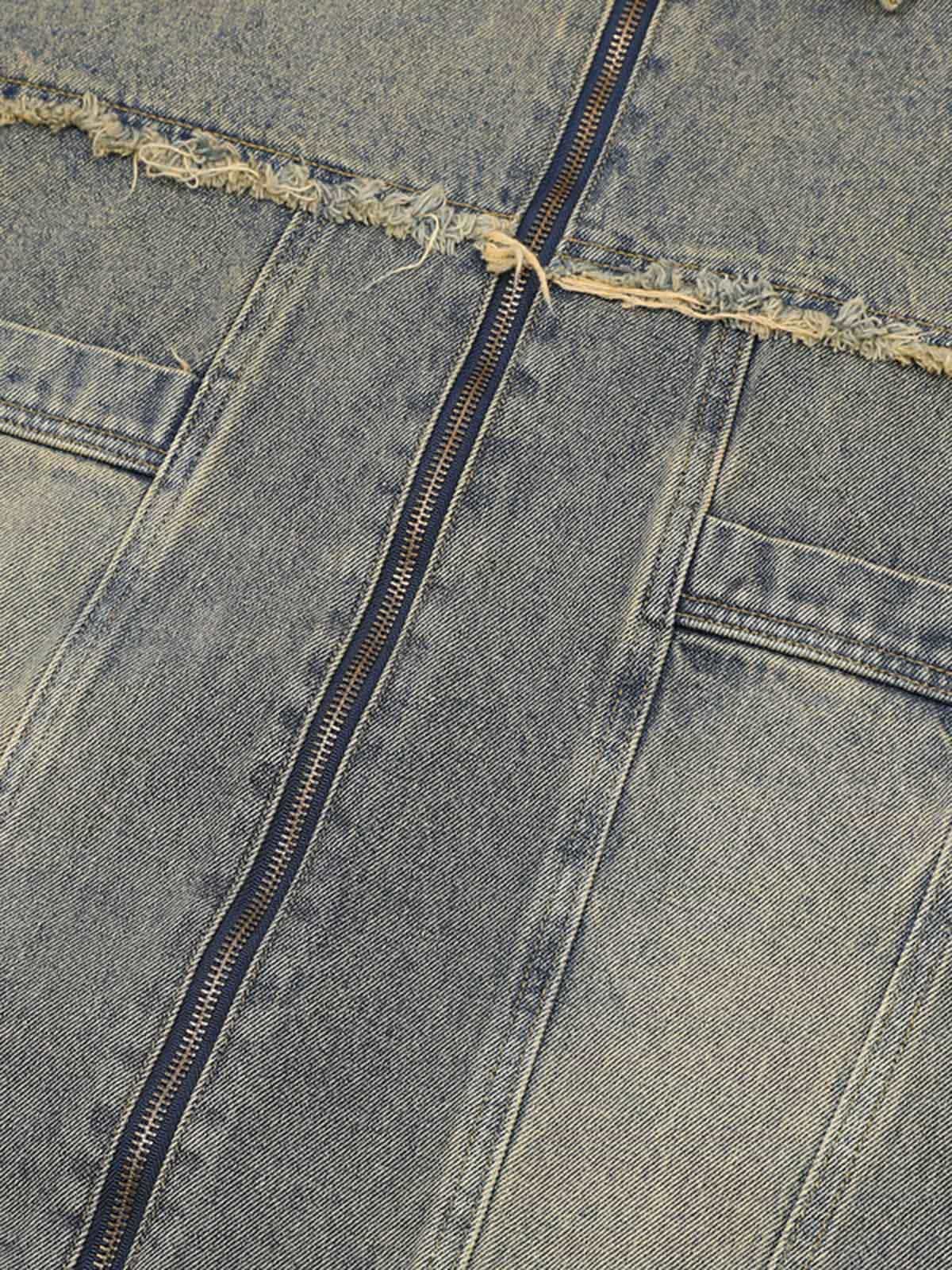 • Design Elements: Ripped details, frayed edges, and front zipper closure