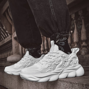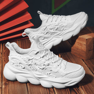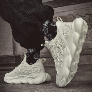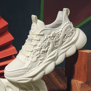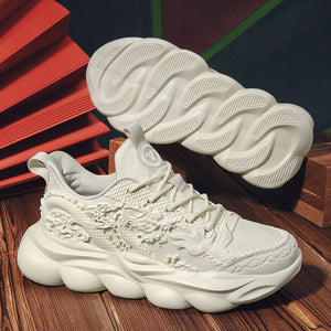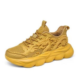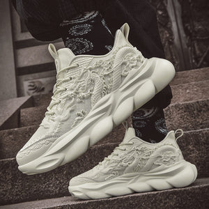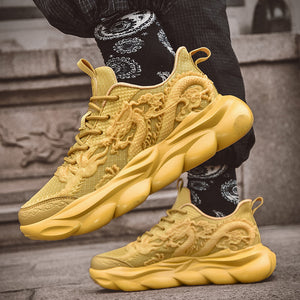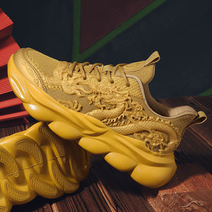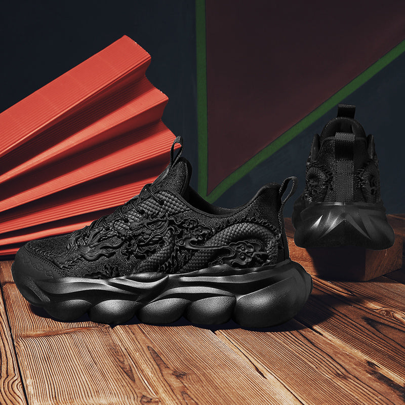🔥 Mythical Upper Design: Embossed 3D dragon artwork woven into hybrid mesh and leather, symbolizing dominance and spiritual power.