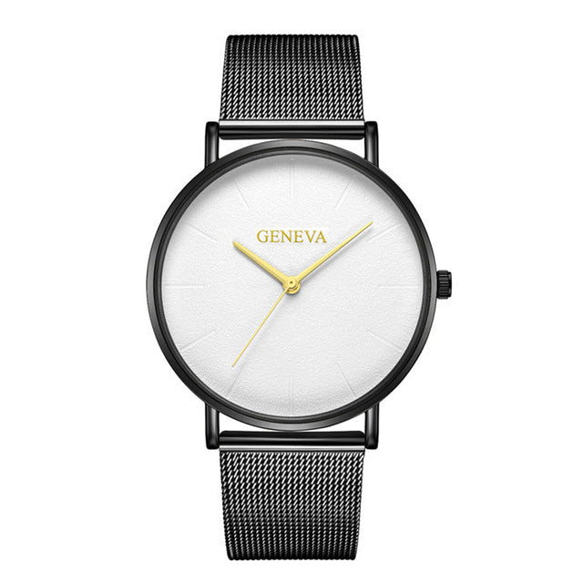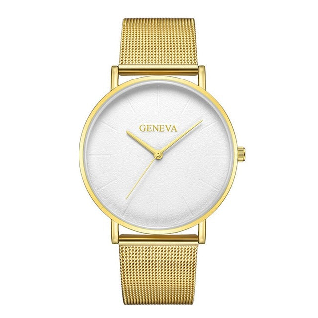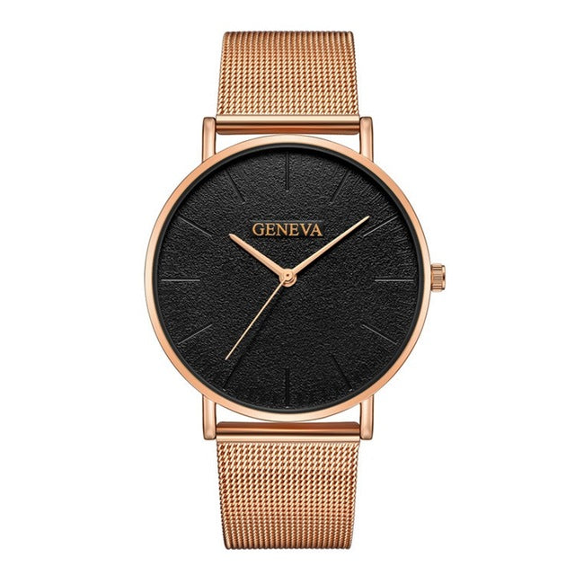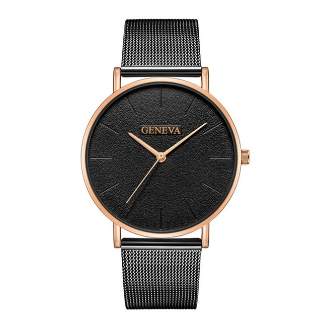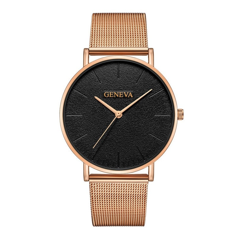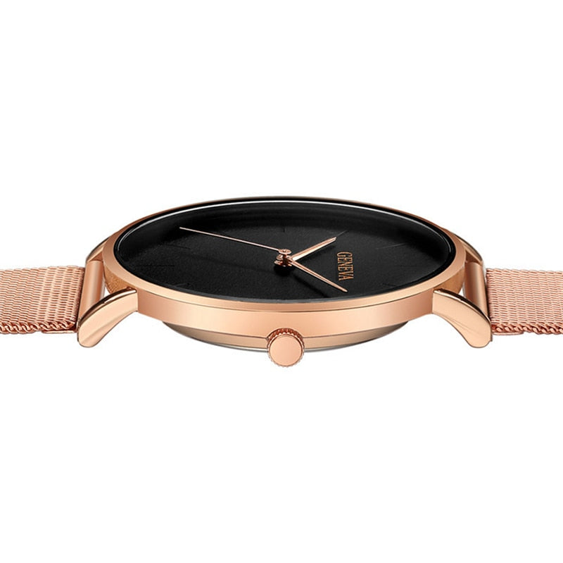 Our new Geneva FUERTE watch uses the stylish Classic Petite case on a fine stainless steel mesh bracelet, giving the watch a sleek and sophisticated, but restrained look. There are four band options to choose from; Black, Rose Gold, Gold and Silver.
