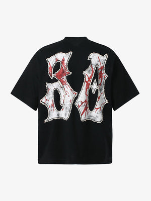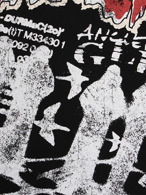 • Design Elements: Bold Red Graffiti Text, Black Silhouette Artwork, Urban Street Style Print