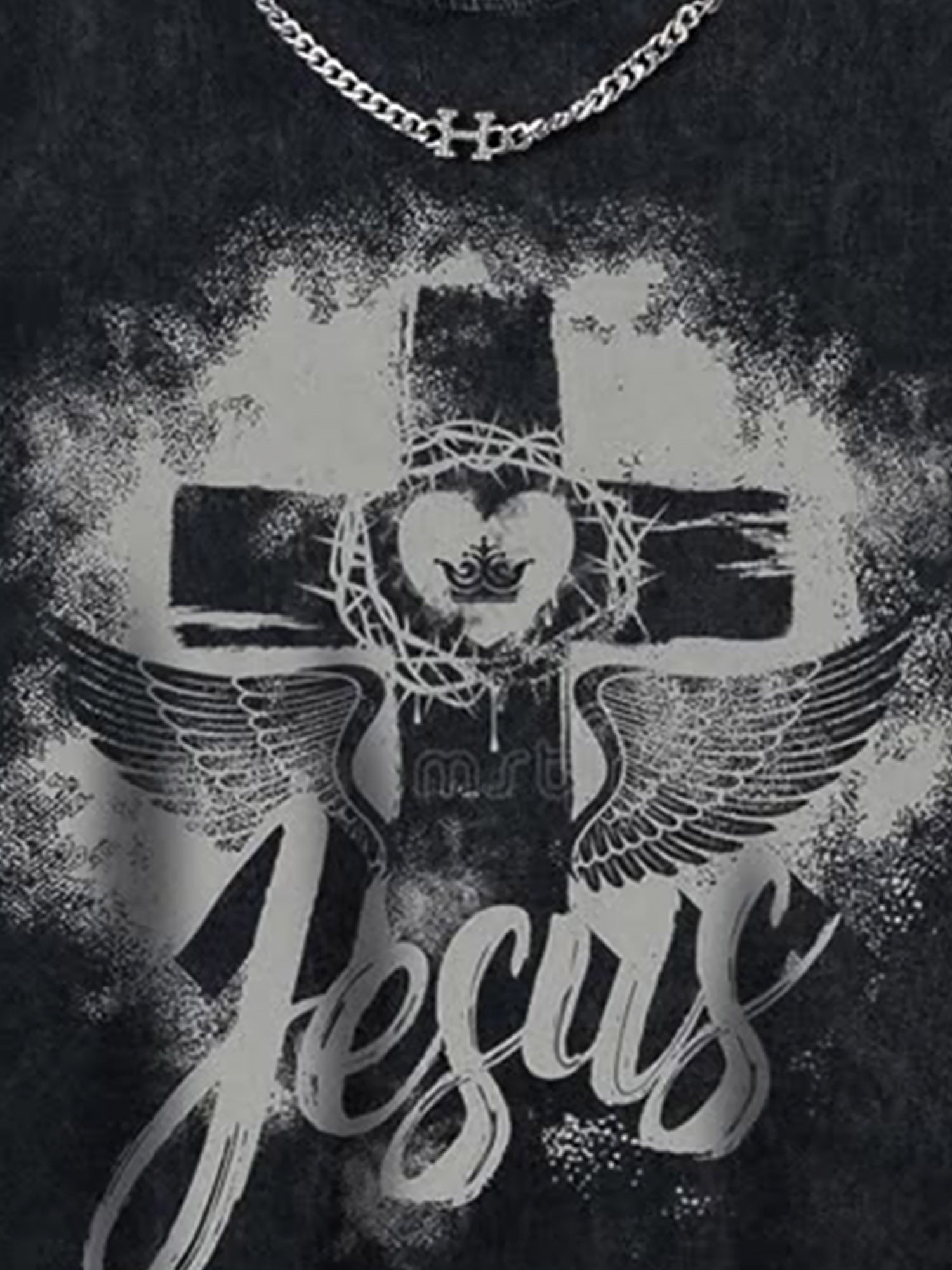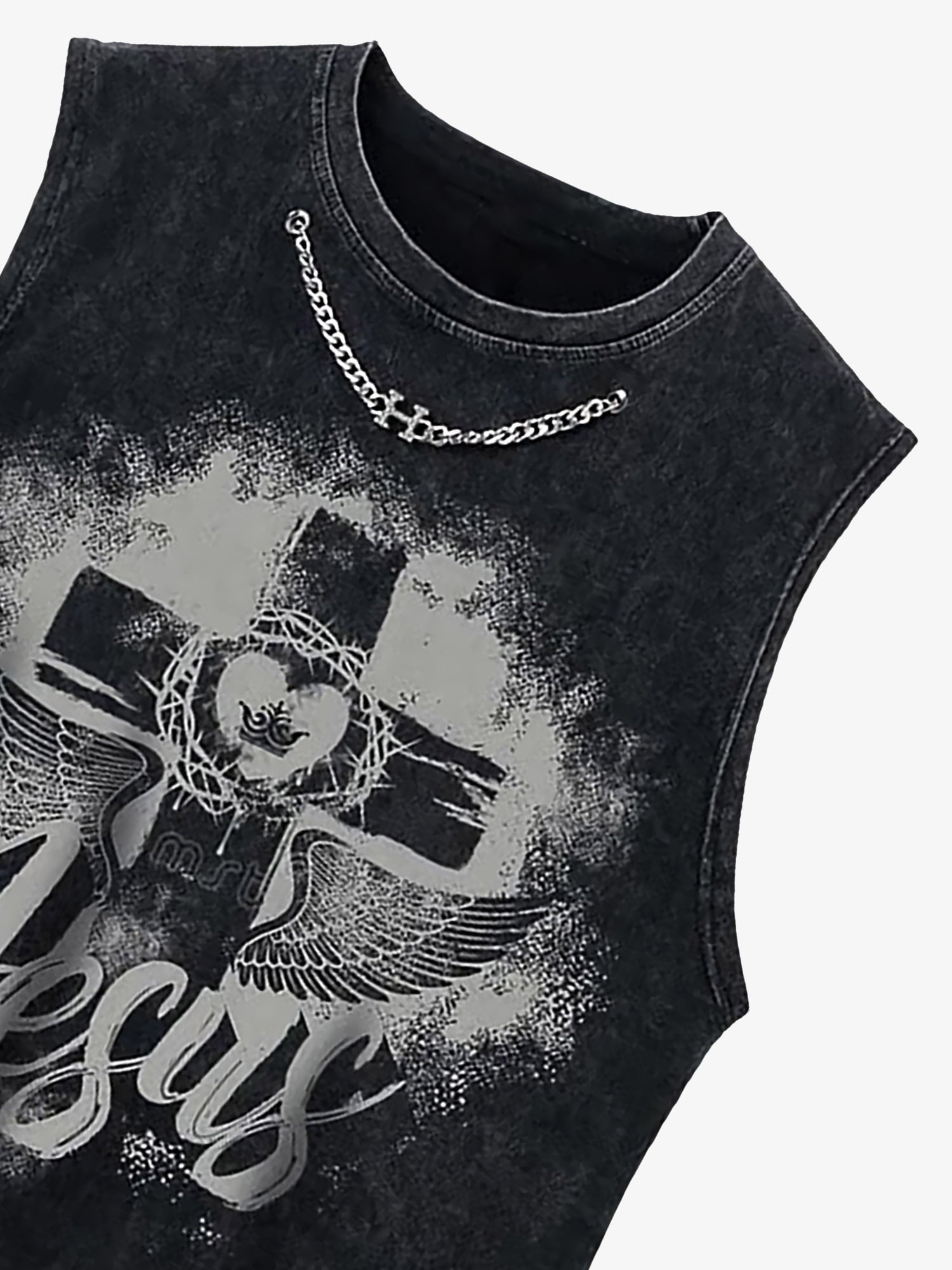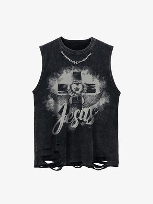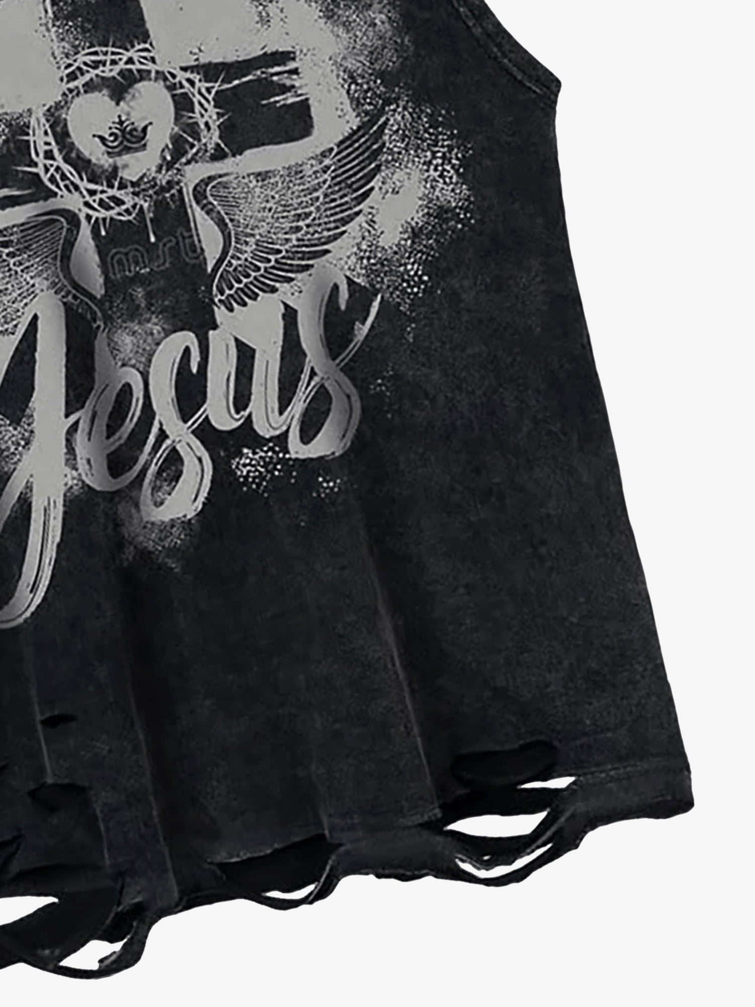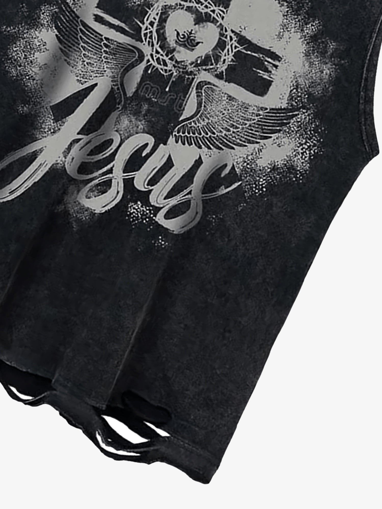 • Detail Features: Distressed Design, Graphic Print, Sleeveless, Crew Neck