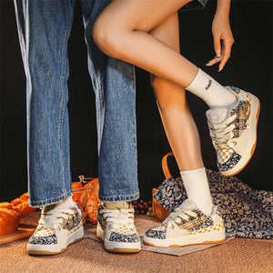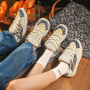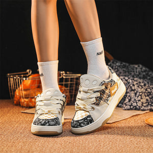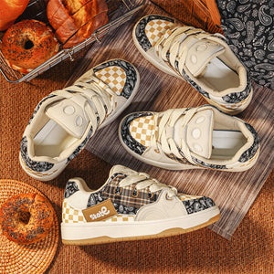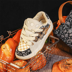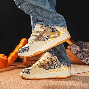 Crafted with a rich tapestry of tones, this colorway stitches together beige leather paneling, classic black paisley prints, and earthy brown tartan overlays. Paired with checkerboard mustard blocks and a soft mesh base, the mix is both eye-catching and effortlessly versatile. A stitched “SkatE” patch seals the deal with rebellious character.