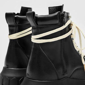 Add an edge to your wardrobe with our premium combat boots, designed for the modern gentleman who values both style and durability. Crafted with a sleek matte black upper and accentuated by cream-coloured laces, these boots redefine contemporary fashion.