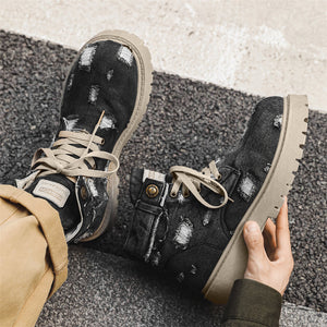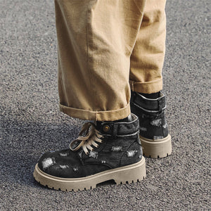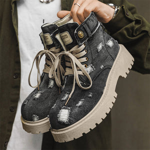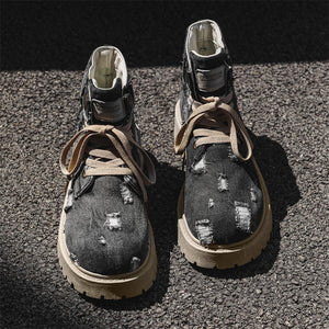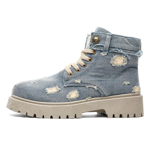 Elevate your casual and rugged style with our Distressed Denim Combat Boots. Designed for those who dare to stand out, these boots combine the timeless appeal of denim with the boldness of distressed accents. Crafted with premium-quality denim uppers and durable rubber outsoles, these boots offer a unique aesthetic and unparalleled comfort.