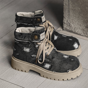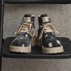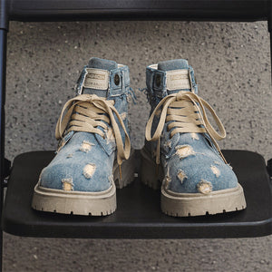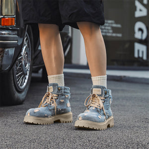 Whether you're heading to a coffee shop, a casual meet-up, or exploring city streets, these distressed denim combat boots add the perfect touch of rugged charm and personality. Step up your footwear game with a pair that's as bold and versatile as you are.