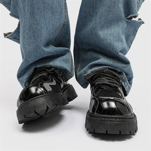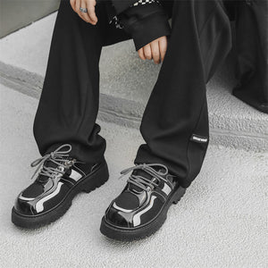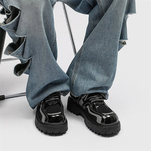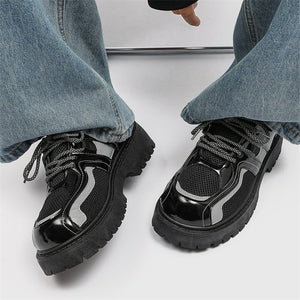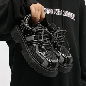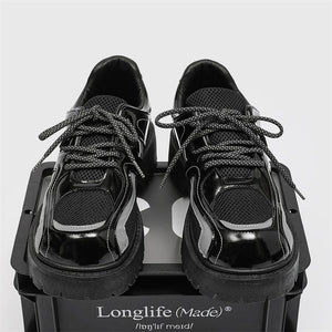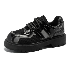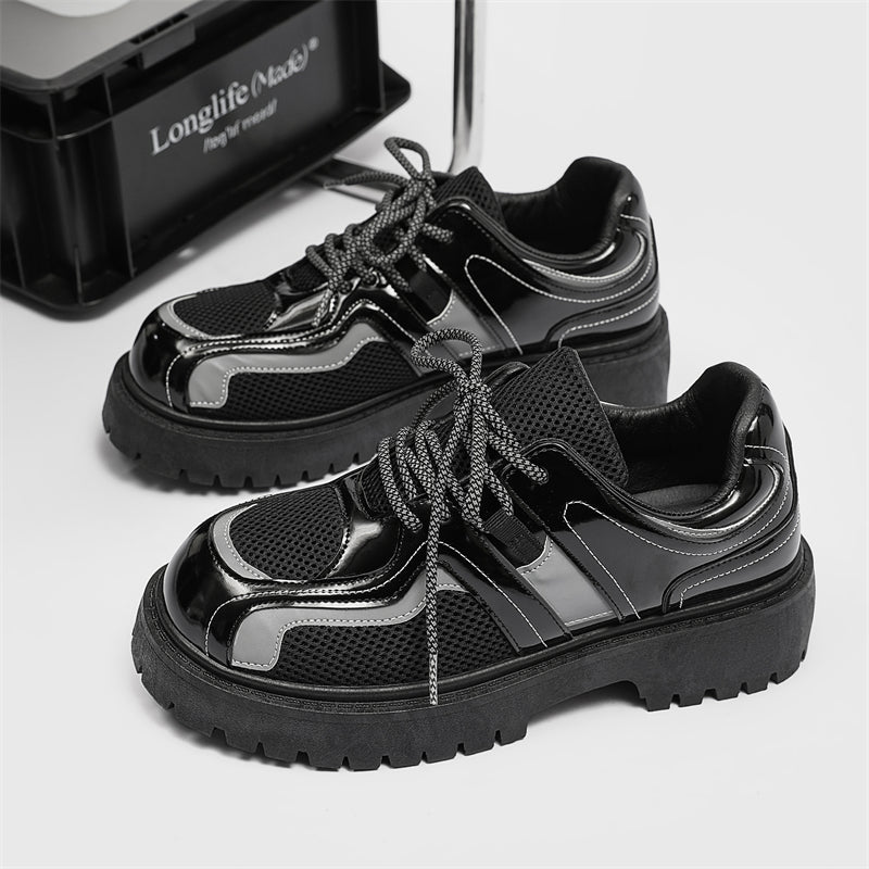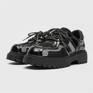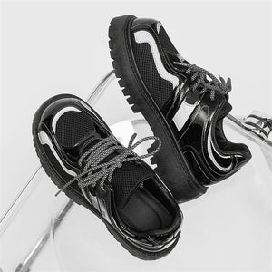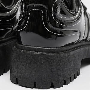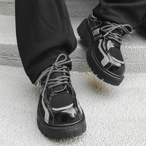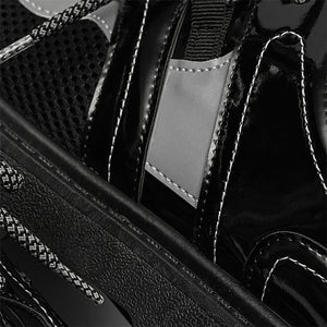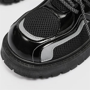 Forge your path in these Reflective Chunky Combat Boots, where bold design meets functionality and innovative style. Featuring a glossy black finish with breathable mesh overlays and reflective silver accents, these boots redefine modern footwear. The reflective laces add a dynamic, eye-catching feature, making you stand out in every step, even in low-light conditions.