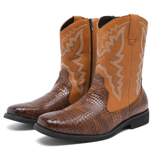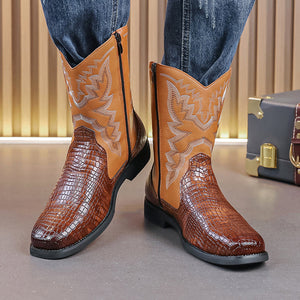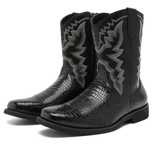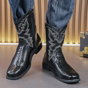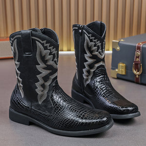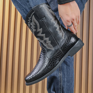 Step into timeless refinement with the Embossed Leather Western Boots, where intricate craftsmanship meets bold styling. Designed with a luxurious faux crocodile leather texture and a traditional western silhouette, these boots are the perfect blend of heritage and modern sophistication. The rich embroidery detail on the shaft adds artisanal charm, making them a standout addition to your footwear collection.