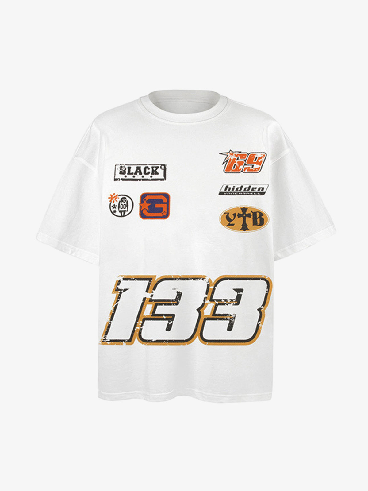 • Design Elements: Large number print, multiple patch designs, distressed look