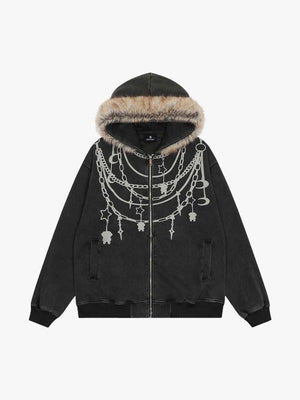 • Design Elements: Intricate chain print design, faux fur-lined hood, star and cloud motifs