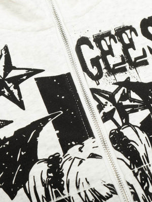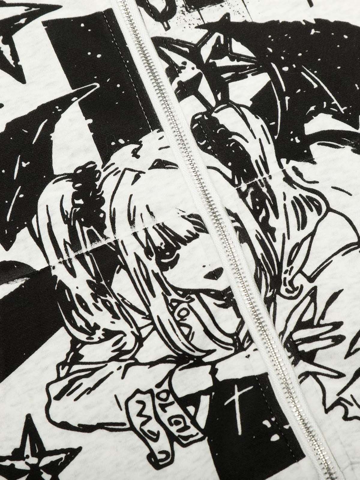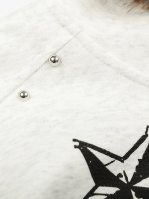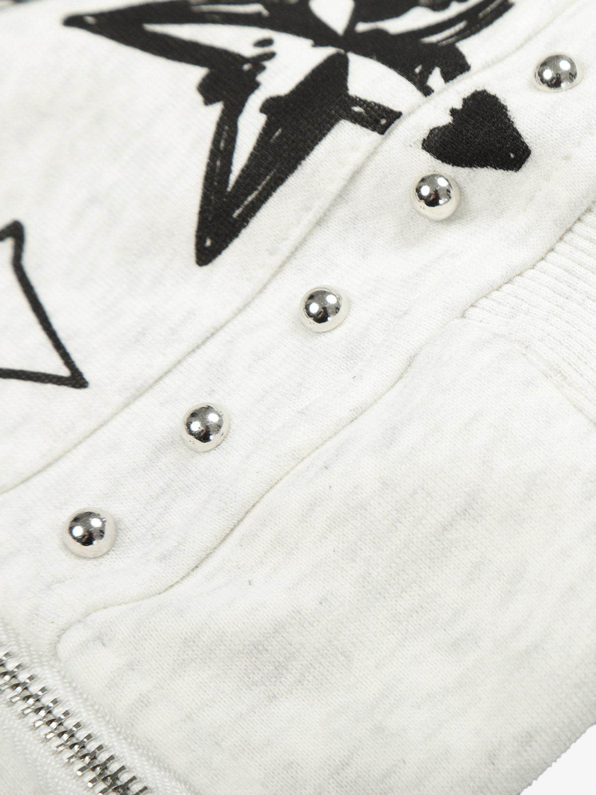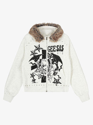 • Design Elements: Bold graphic print featuring a character with stars and wings, faux fur collar, studded details