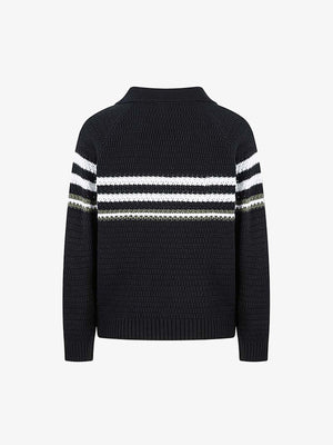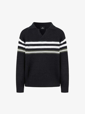 • Design Elements: Bold horizontal stripes, classic polo collar, ribbed cuffs and hem