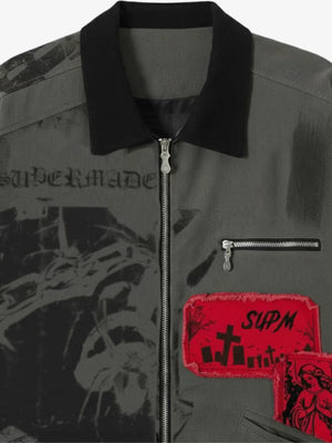 • Design Elements: Bold graphic prints, red embroidered patches, black contrast collar