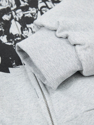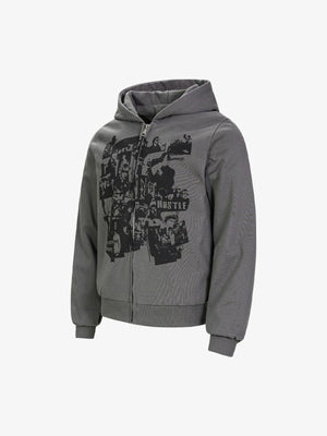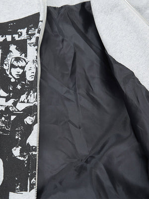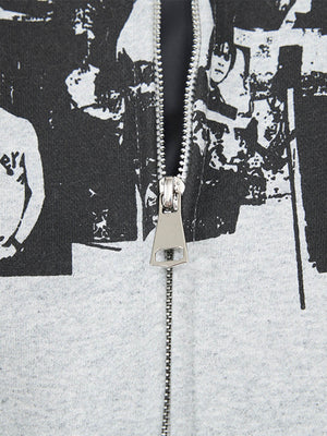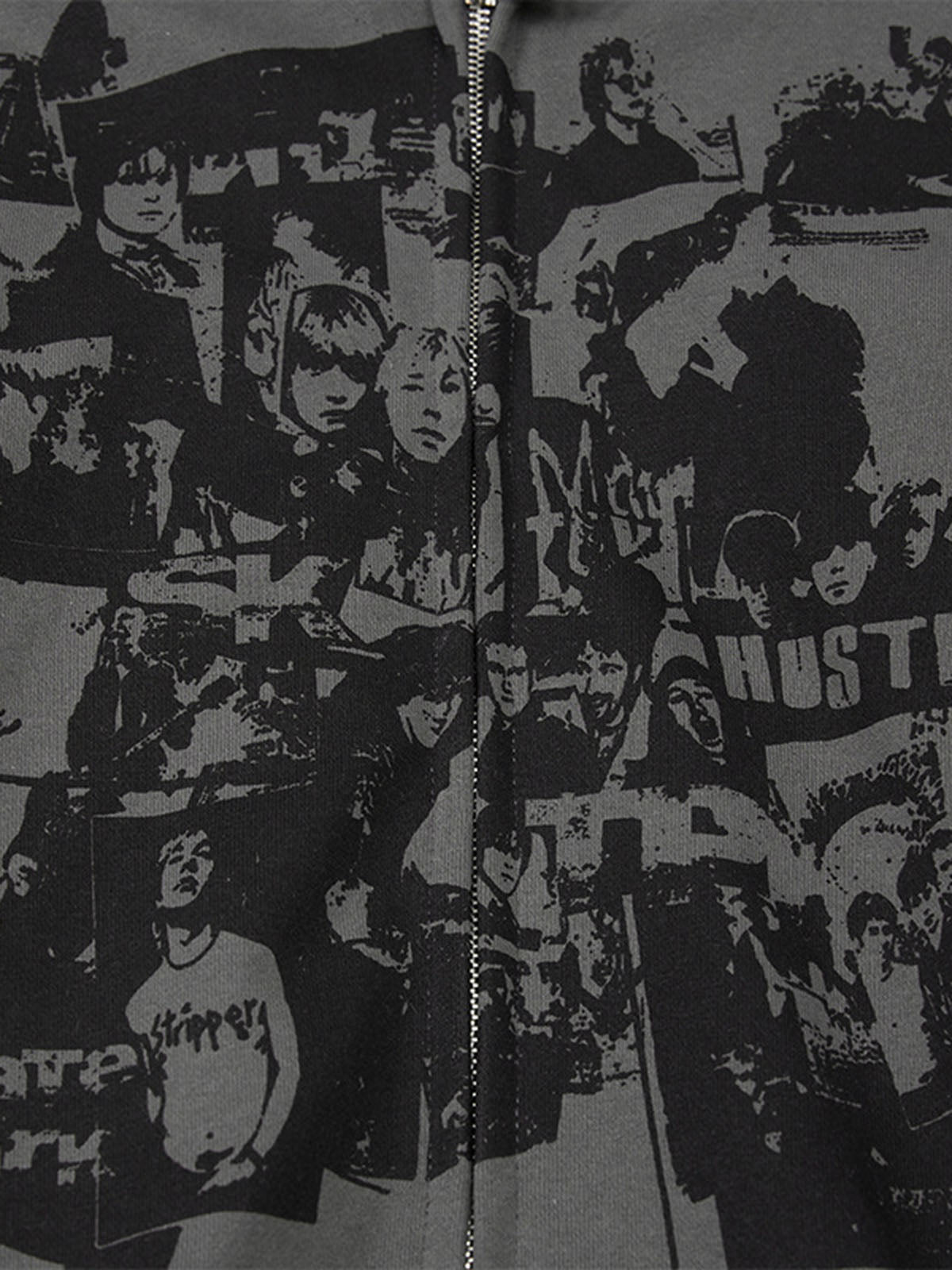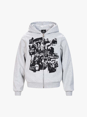 • Design Elements: Bold graphic print featuring collage-style images and text