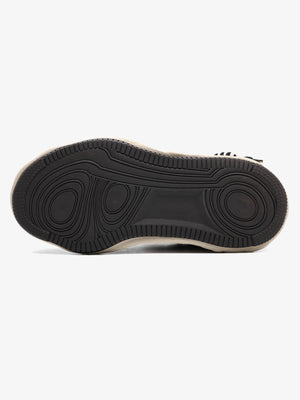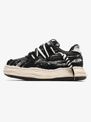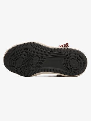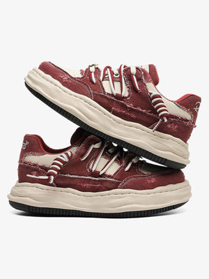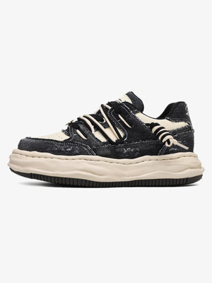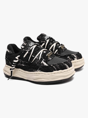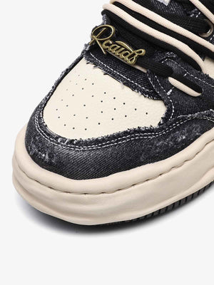 • Design Elements: Distressed denim look, striped laces, embroidered text details
