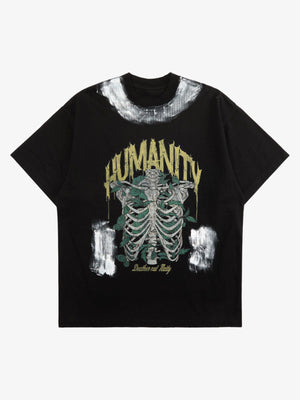 • Design Elements: Distressed Typography, Intricate Skeleton Artwork, Leaf Accents
