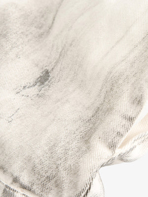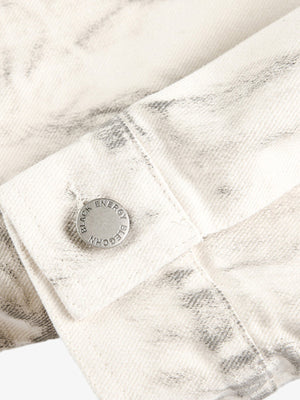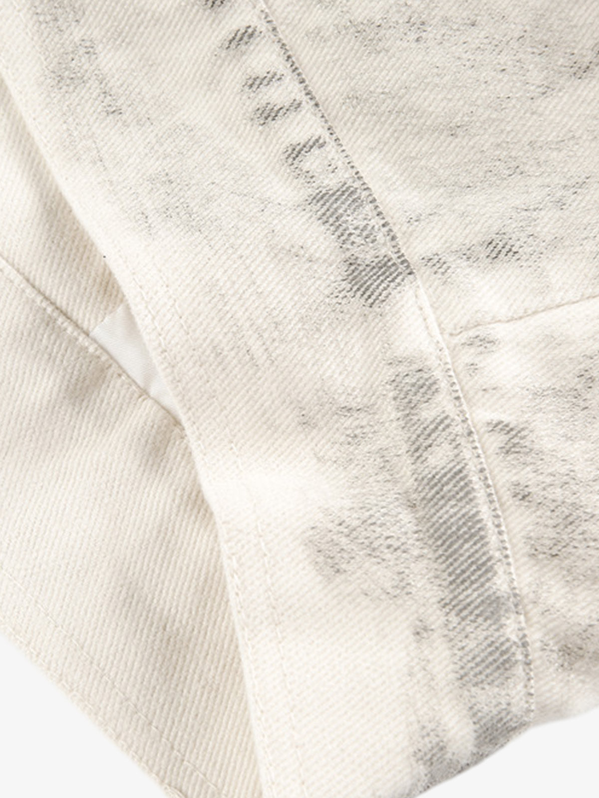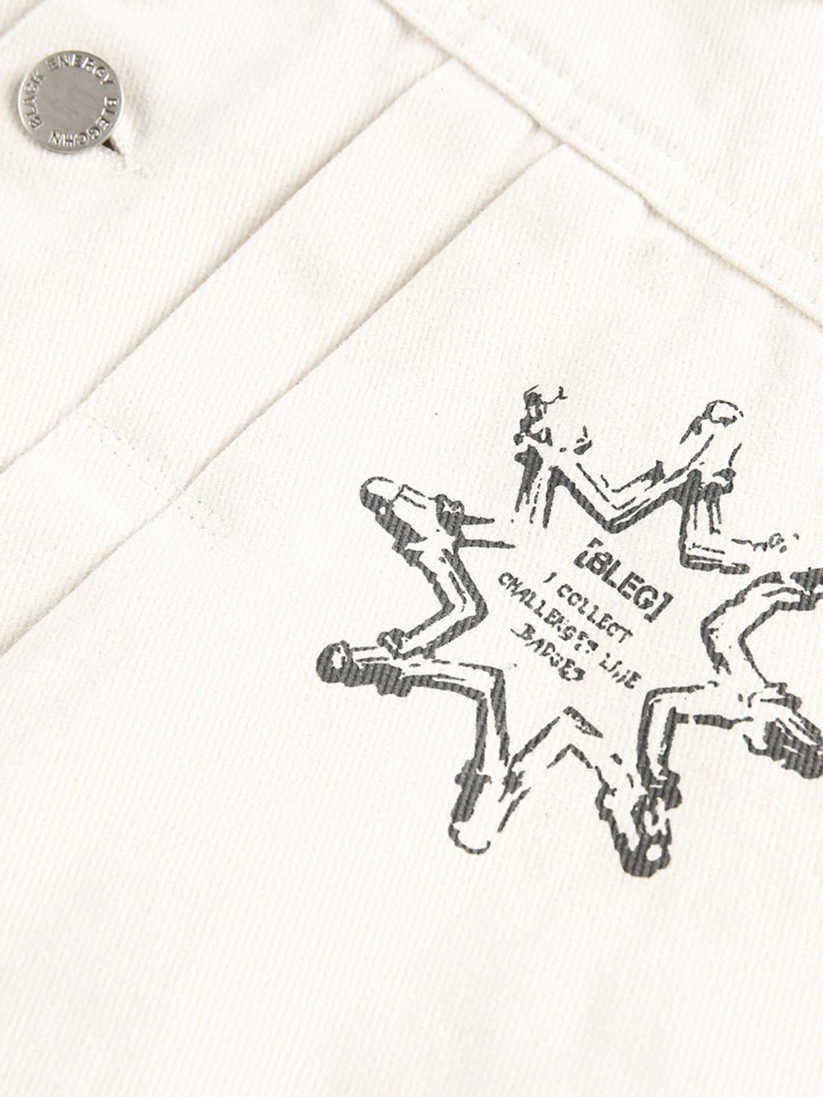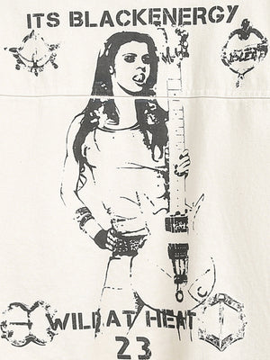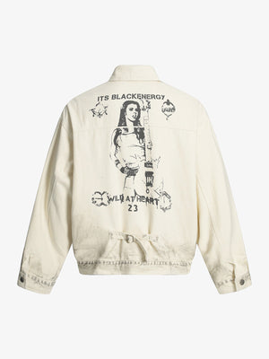• Design Elements: Bold back graphic print, distressed details, adjustable waist tie