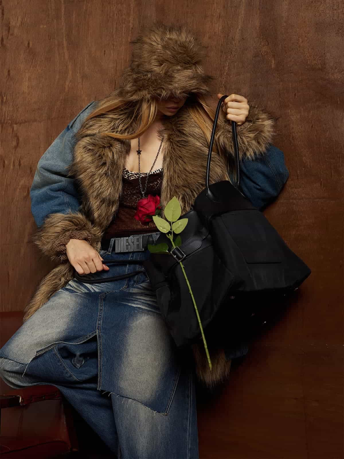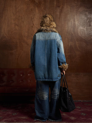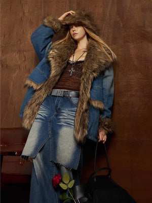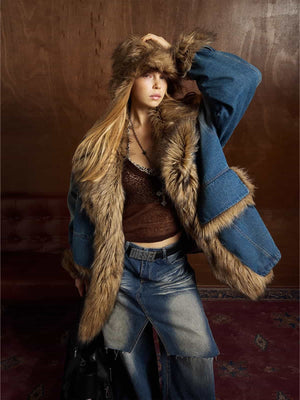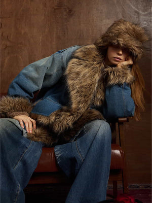 Street Retro Fur Patchwork Washed Denim Cotton Jacket