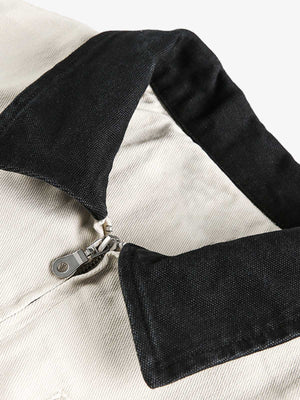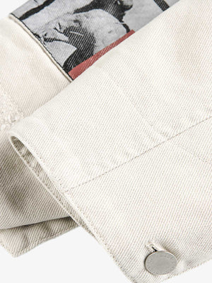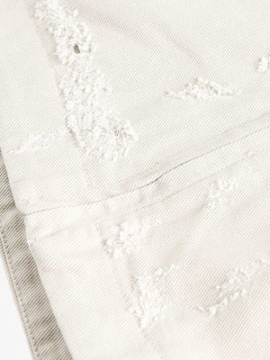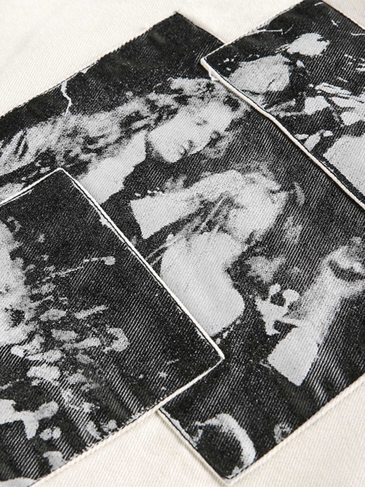 • Design Elements: Distressed details, bold lettering on the chest pocket, graphic patch on the sleeve