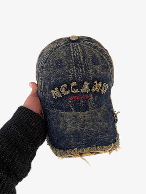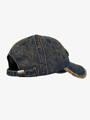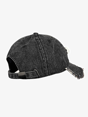 • Design Elements: Distressed edges, embroidered letters on the front, adjustable strap at the back