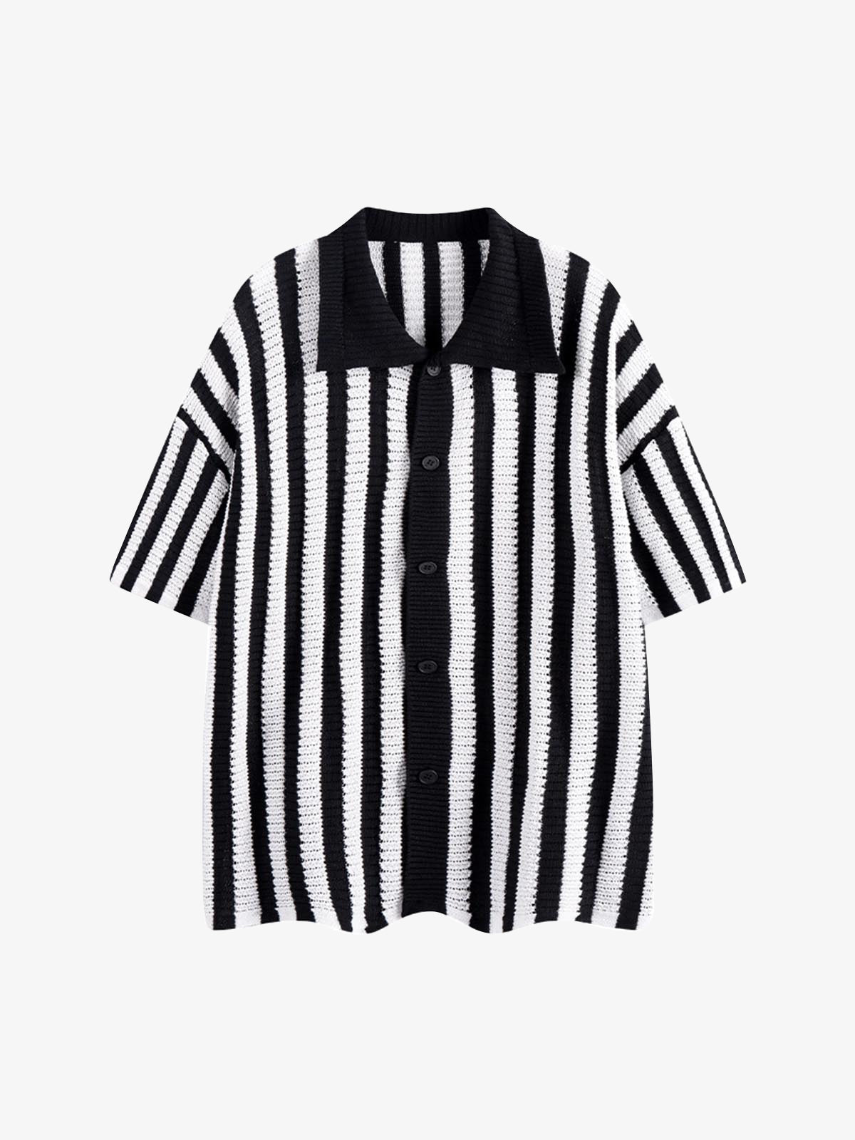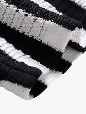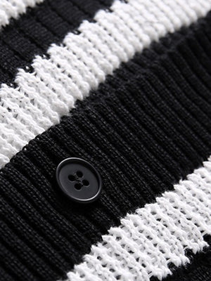 • Design Elements: Contrast black and white stripes, button closure, ribbed texture