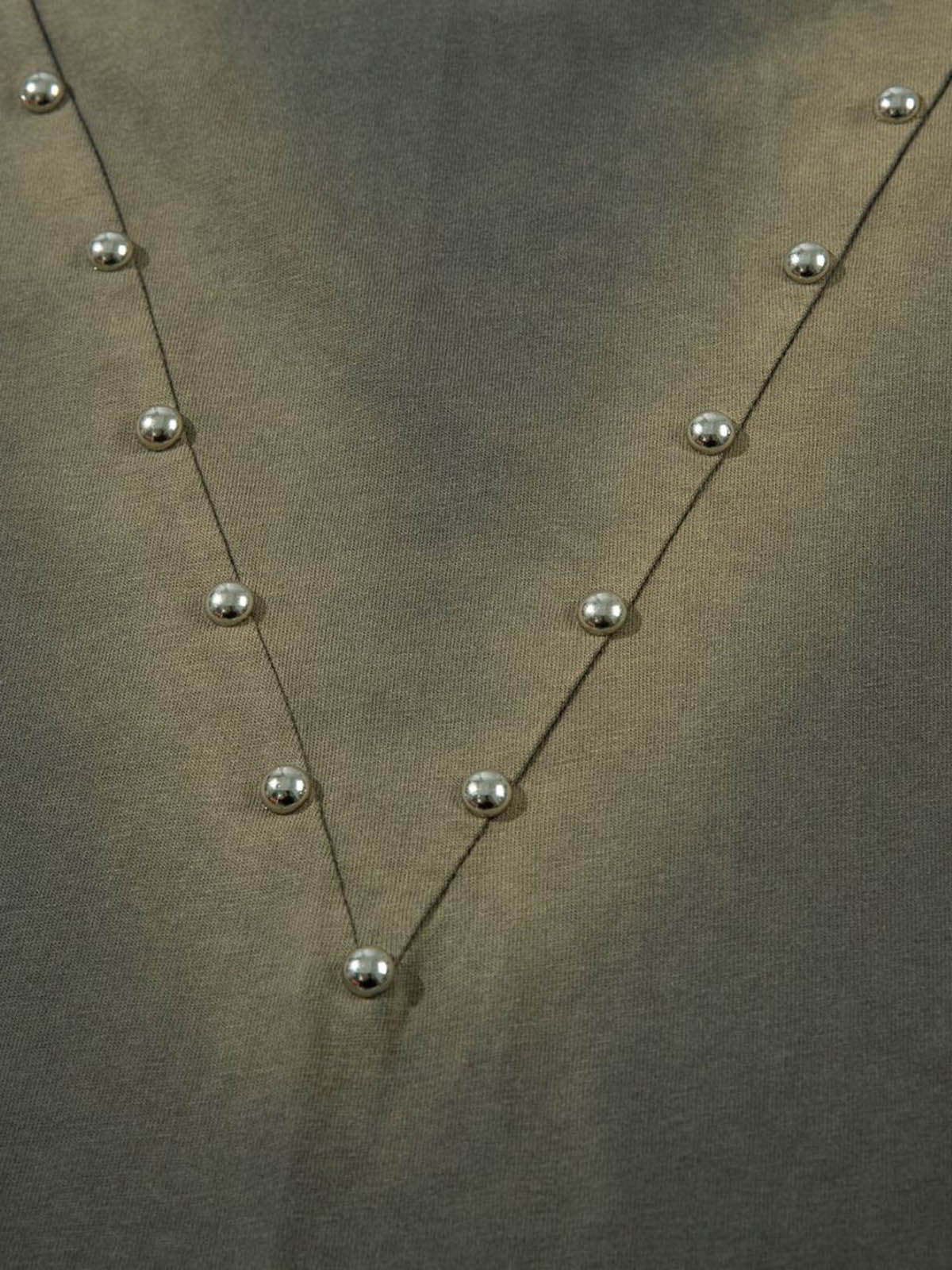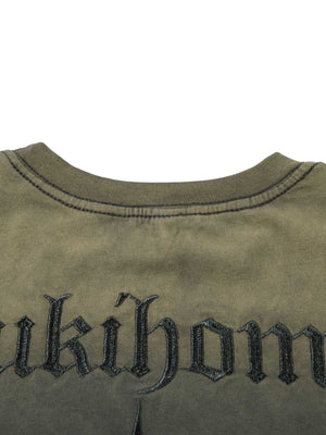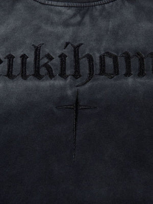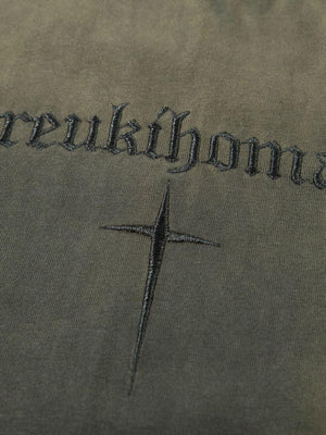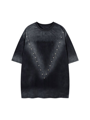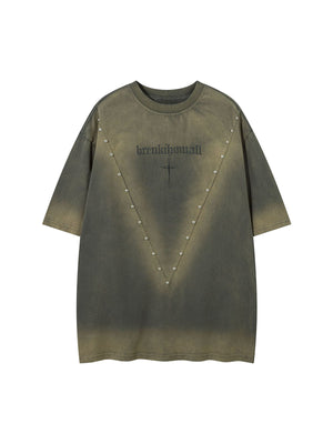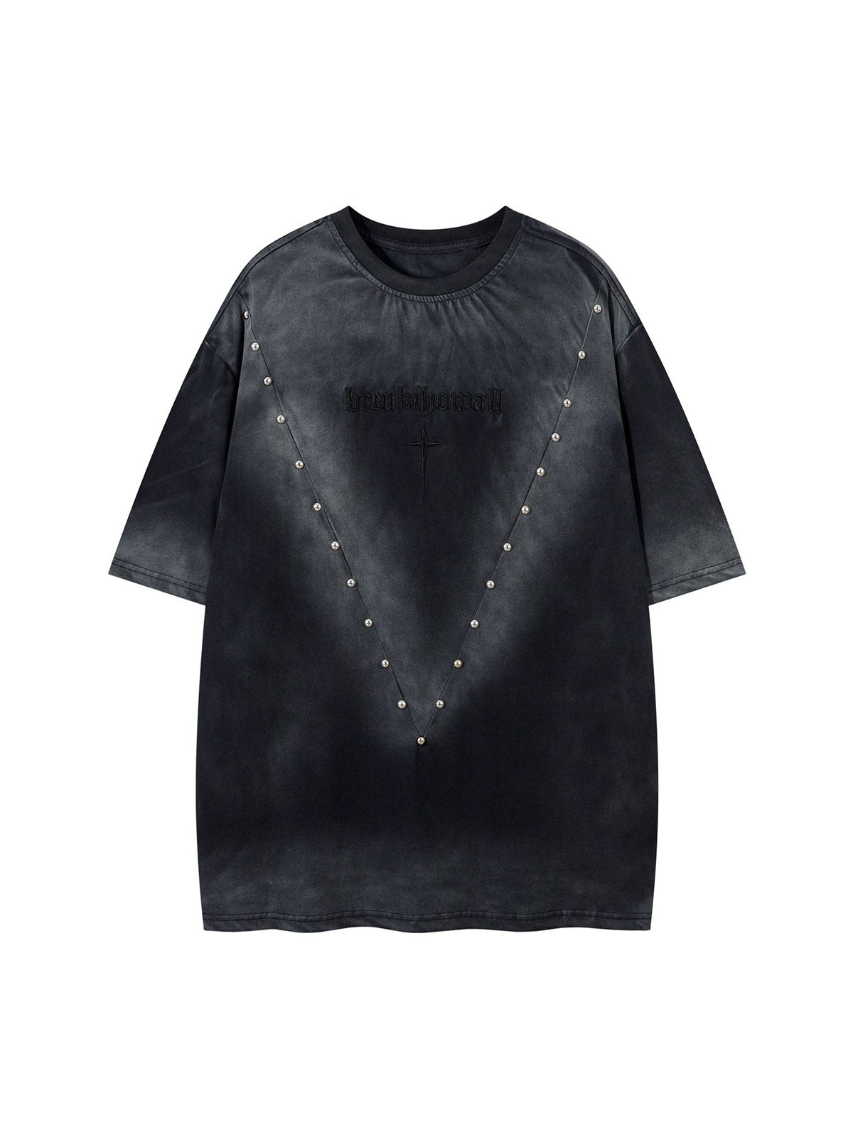 • Design Elements: Embossed cross graphic, studded V-neckline, distressed look