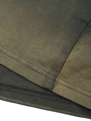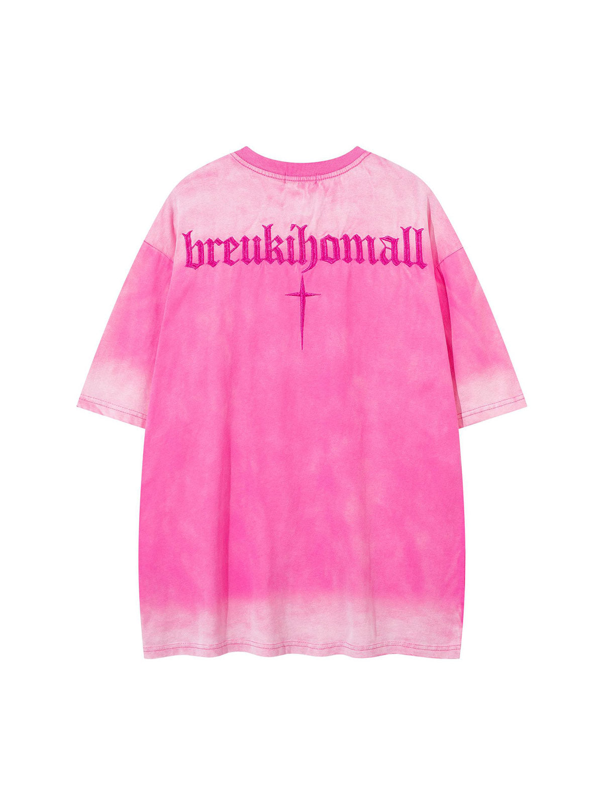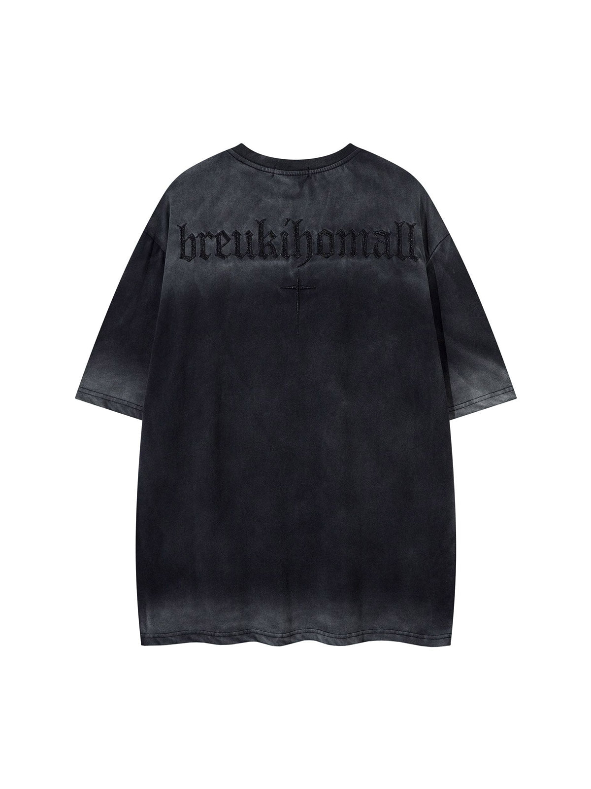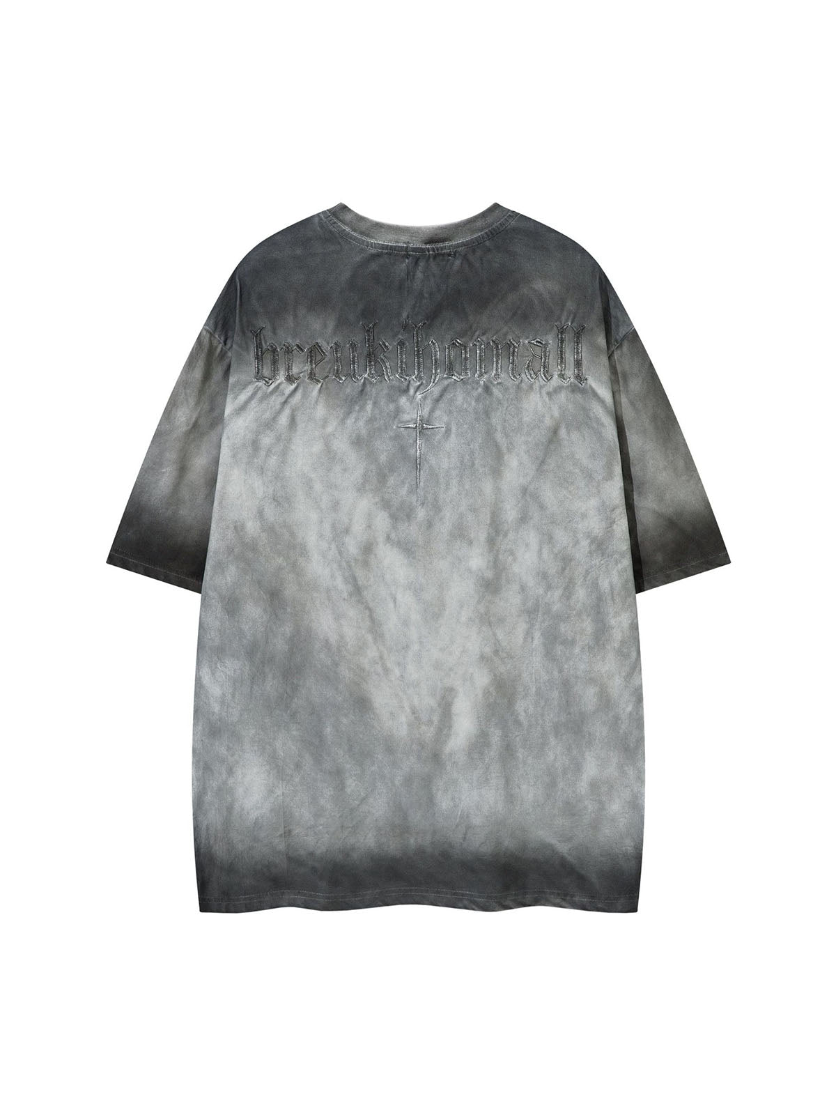 • Design Elements: Embossed cross graphic, studded V-neckline, distressed look