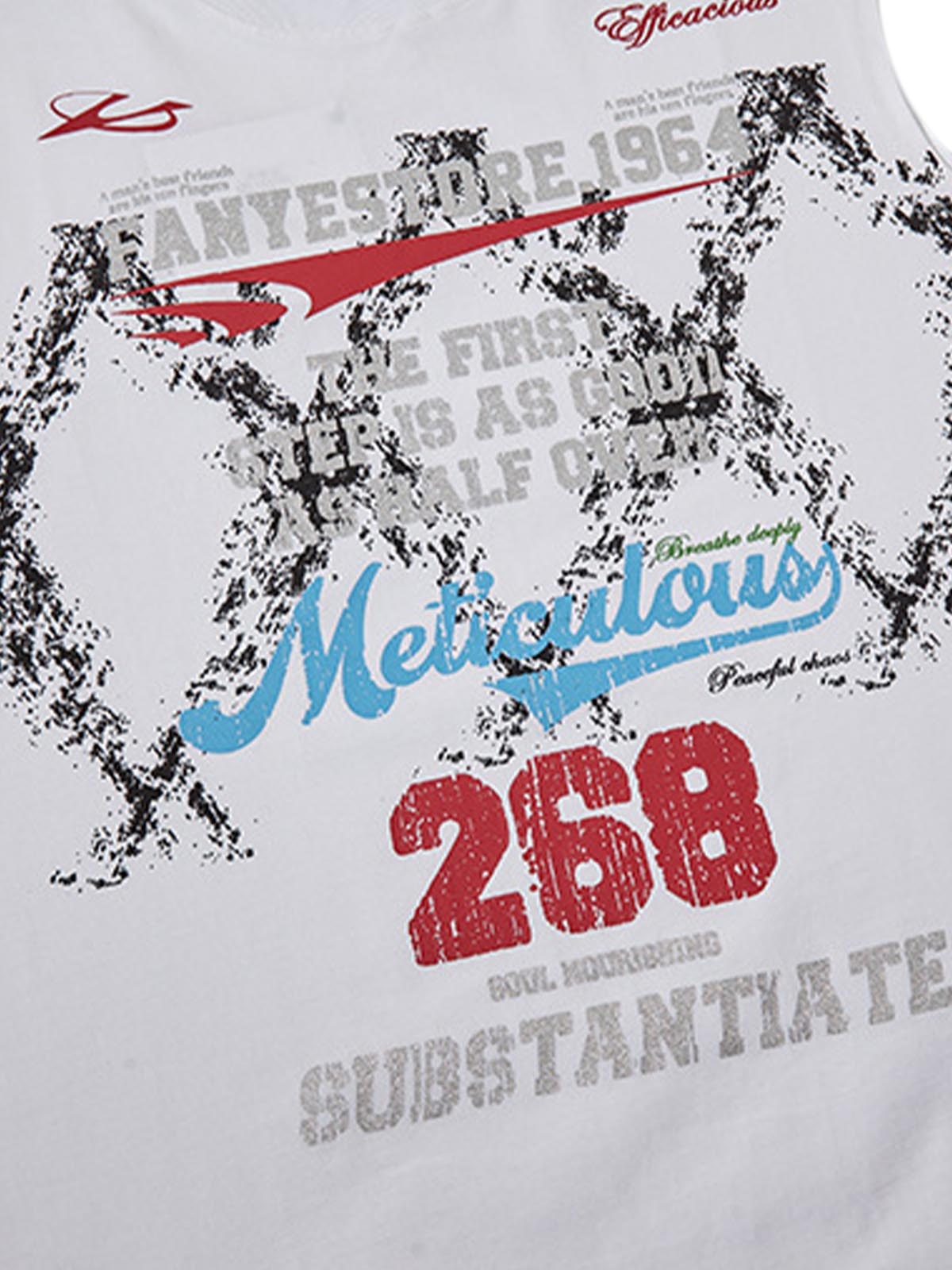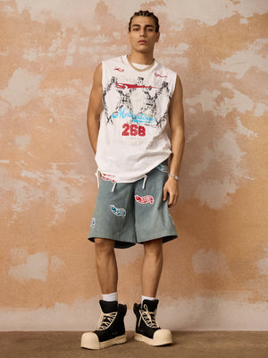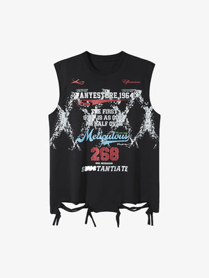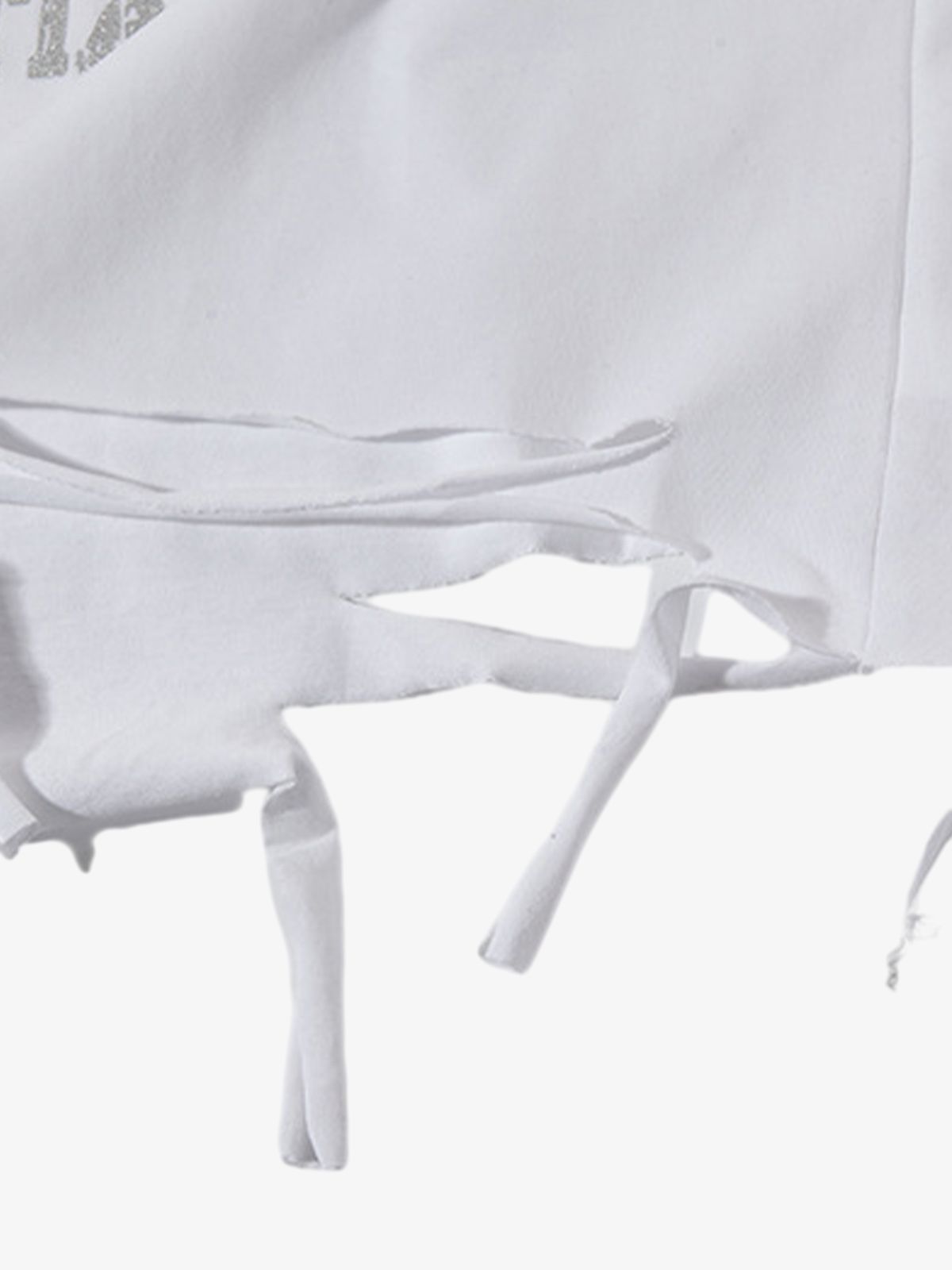 • Design Elements: Bold graphic print, distressed details, side ties