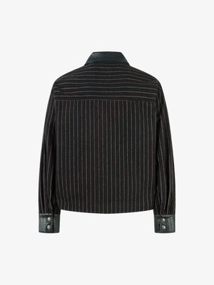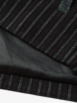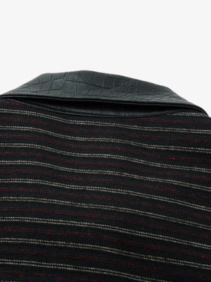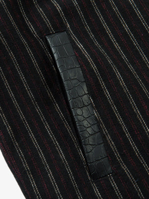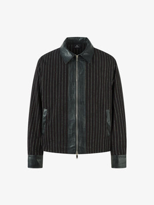 • Design Elements: Vertical stripes, leather accents on collar and cuffs, front zipper closure