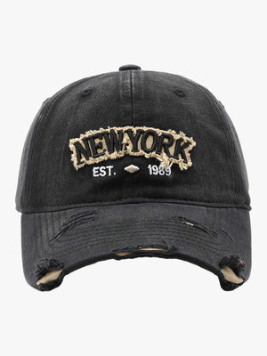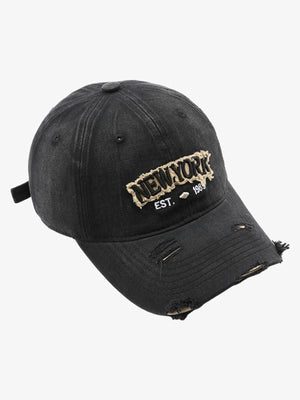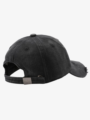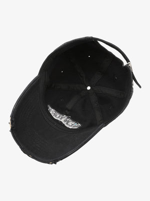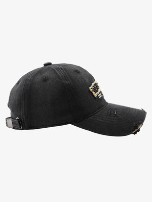 • Design Elements: Embroidered text, distressed edges, adjustable strap